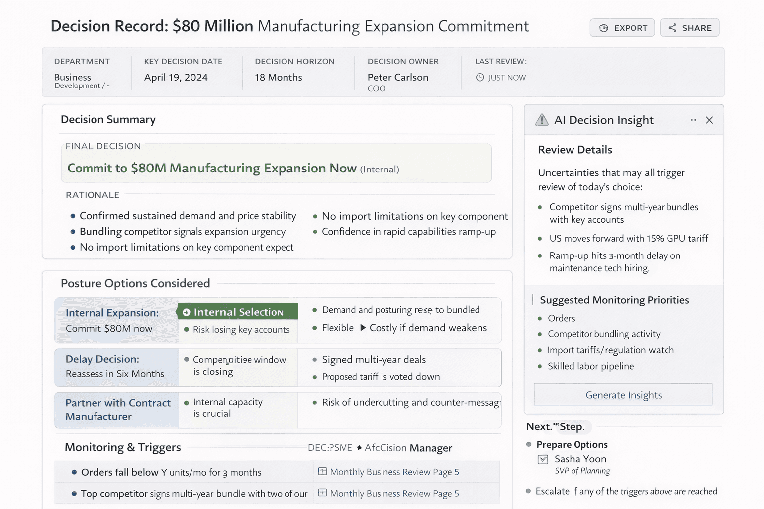 Notice what is absent – any claim that AI “recommended” the decision. AI helped structure inputs and stress test assumptions. A human owned the logic, the evidence, and the triggers.