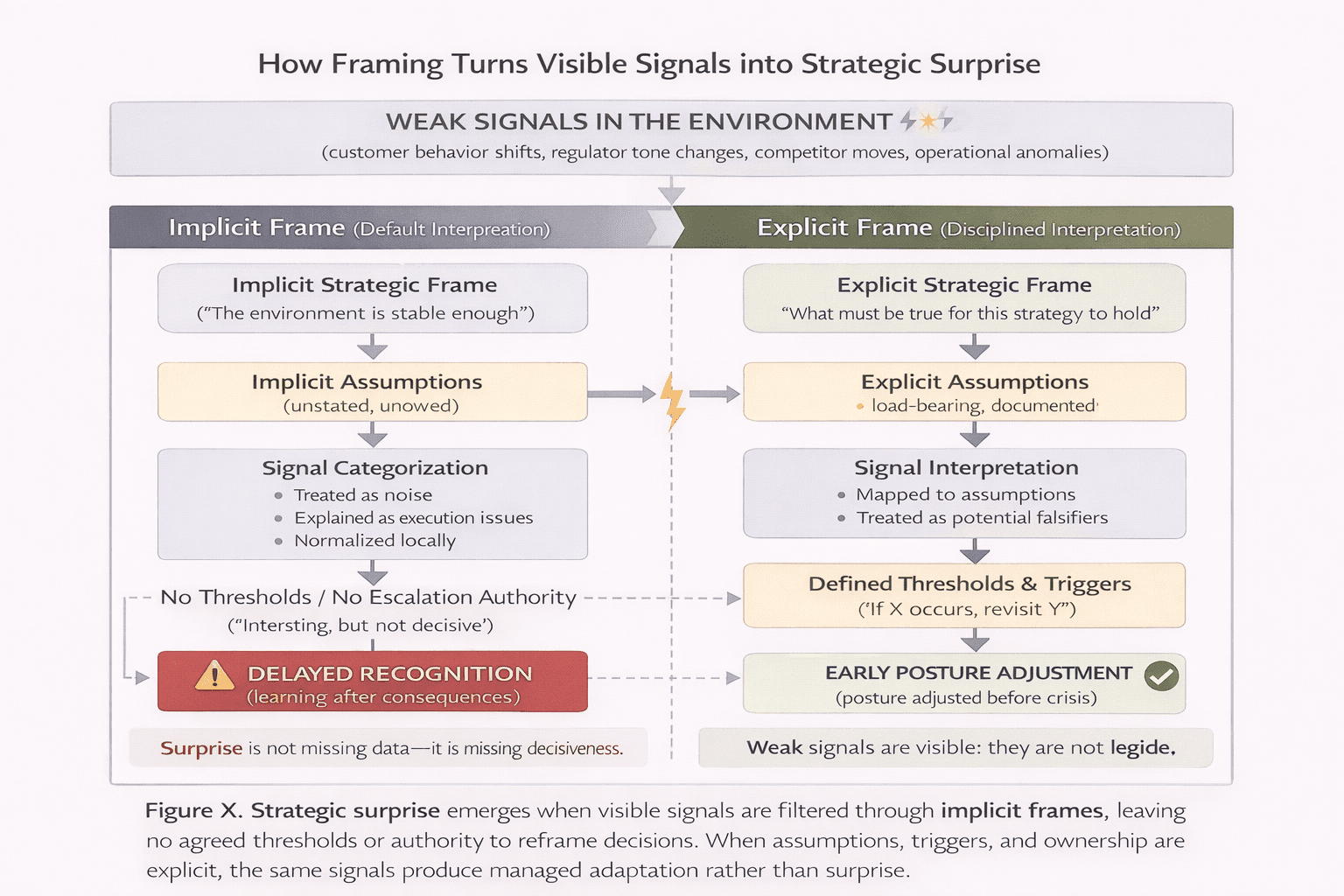 How framing fails strategically: The organization frames the environment using yesterday’s baseline. It assumes continuity. It treats disconfirming signals as temporary disturbances. It explains away anomalies, because acknowledging them would force a reconsideration of commitments that are already underway.